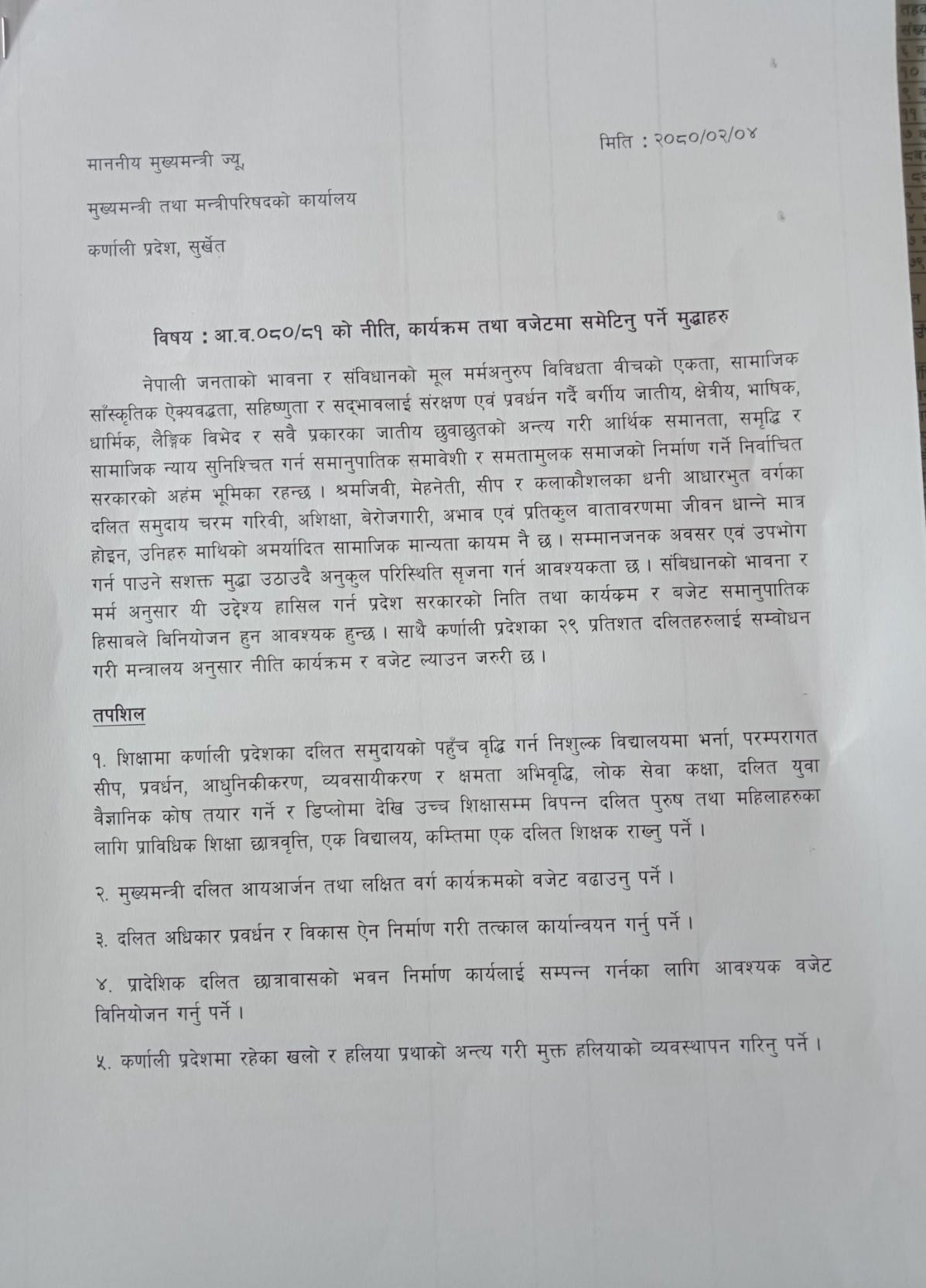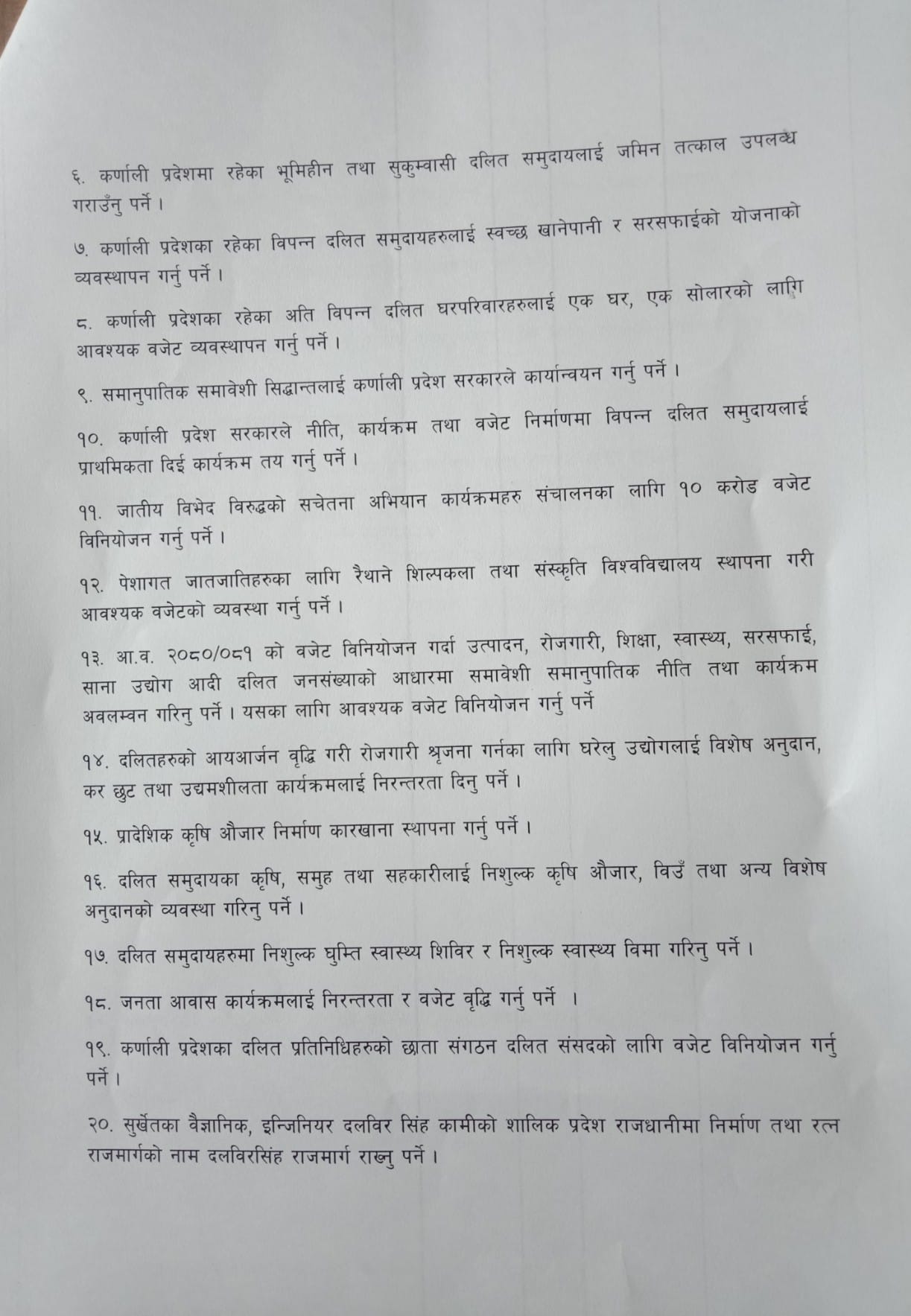 पत्रमा प्रादेशिक दलित छात्राबासको भवन निर्माणका लागि आवाश्यक बजेट विनियोजन, मुख्यमन्त्री दलित आयआर्जन तथा लक्षित वर्ग कार्यक्रममा बजेट बढाउनुपर्ने, खलो र हलिया प्रथाको अन्त्य गरी मुक्त हलियाको व्यवस्थापन गर्नुपर्ने लगायतका मागहरु उल्लेख गरिएको छ ।
