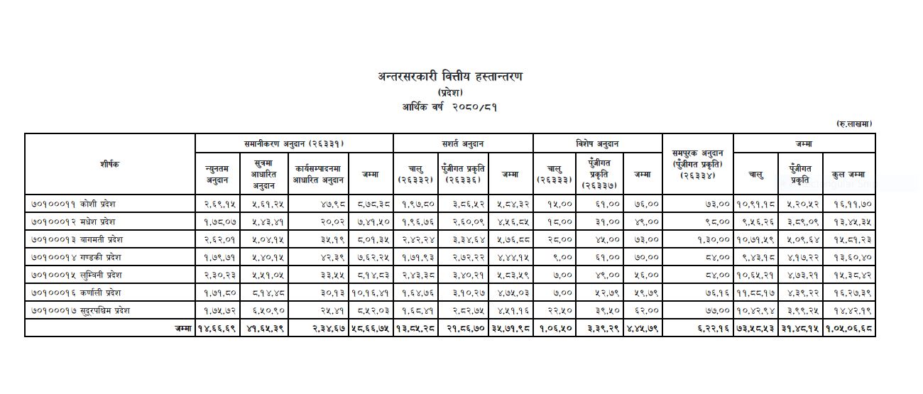 यस्तै, समानीकरण अनुदानतर्फ १० अर्ब १६ करोड ४१ लाख, सशर्त अनुदानतर्फ ४ अर्ब ७५ करोड ३ लाख, विशेष अनुदानतर्फ ५९ करोड ७९ लाख बजेट रहेको छ । यस्तै पुँजीगत प्रकृतिको समपूरक अनुदानतर्फ ७६ करोड १६ लाख बजेट कर्णालीले पाएको छ ।